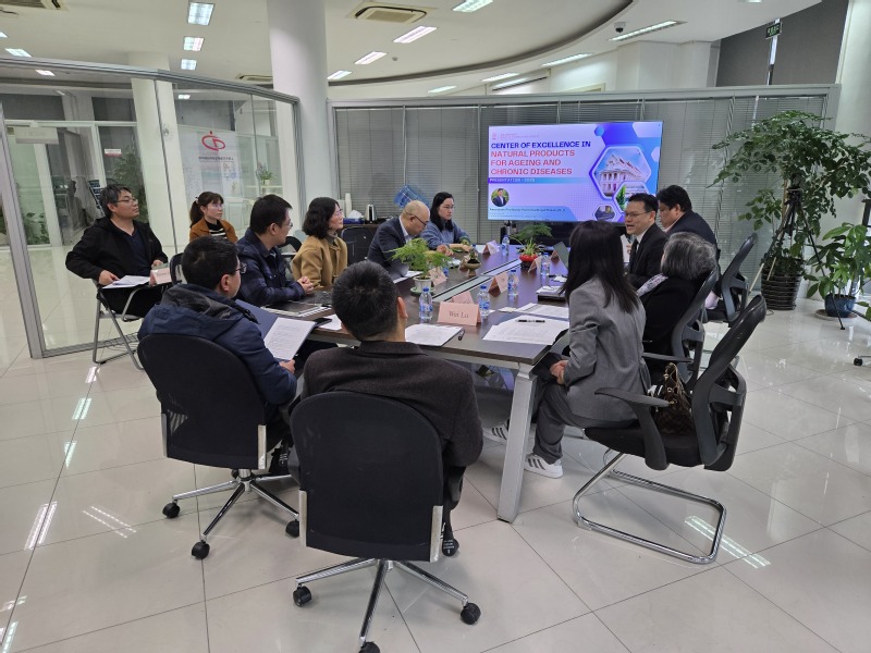 王建新首先致欢迎词,指出本次会晤建立在2024年ccav 与朱拉隆功大学ccav 签订合作谅解备忘录的基础上,是进一步探讨深入合作领域,丰富合作形式的良机。接着,潘俊介绍了ccav 的基本情况,着重讲解了多项学院近年来所获得的科研突破和转化成果。Pornchai Rojsitthisak作为朱拉隆功大学老龄化与慢性疾病天然产物卓越中心主任,详细介绍了中心的科学研究情况,随同来访的Opa Vajragupta教授则介绍了该院分子探针成像研究进展情况。随后,参会的药剂学系主任张志文教授、放射药学与分子影像中心主任王璐青年研究员和天然药物学系副主任程志红教授分别介绍了各自系室的研究情况,药剂学系陆伟教授详细介绍了光热治疗方面的最新研究进展。