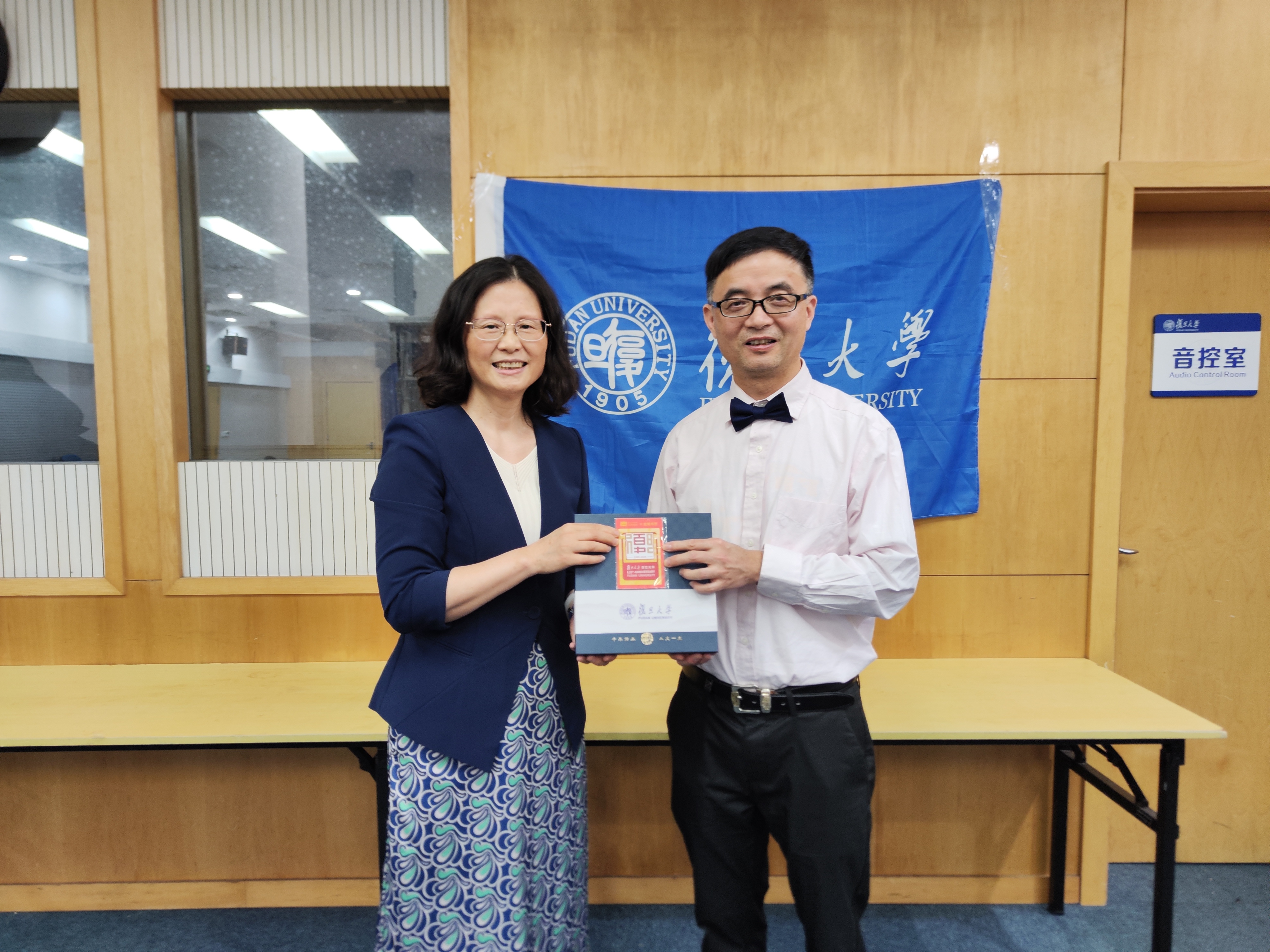 在研讨会的结尾,ccav 副院长潘俊向温国霖赠送校庆礼物。本次研讨会的成功举办,为药学教育和临床药学实践的发展注入了新的活力,也为在场的每一位参与者带来了深刻的思考启示。
