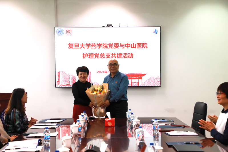 王建新首先对张玉侠一行的到来表示热烈欢迎,并提出对未来开展教学、科研等工作合作的高度期待。他指出,新药的研发应以患者为中心,以解决患者未被满足的临床需求为目标,未来双方可以在药物临床评价、剂型设计等领域开展合作,以使药物发挥更好的作用,进一步提升人民健康服务能力和水平。接着,王书记代表学院党委向护理团队献上鲜花,为她们送上节日的祝福和真挚的问候。