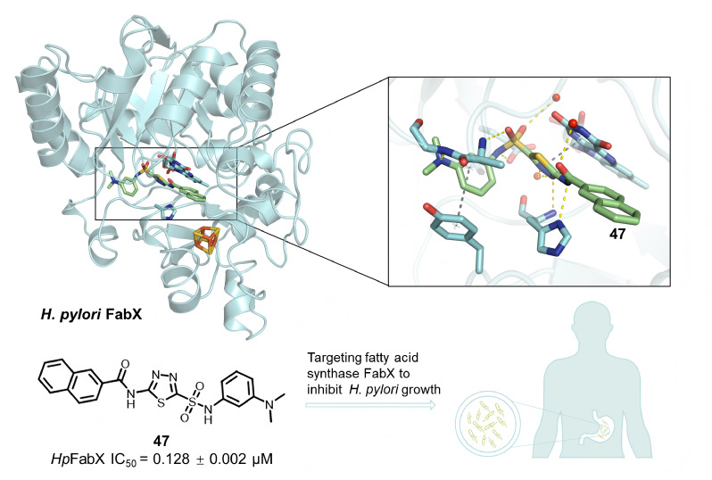 本研究通过高通量筛选实体化合物库,获得具有1,3,4-噻二唑磺酰胺骨架的命中化合物P61G11,进行抑制活性和结合力的验证,并通过X-射线晶体衍射明确该化合物结合在FabX的FMN活性中心,阻止了酰基ACP底物的磷酸泛酰巯基乙胺臂的插入和氧气分子的进入,从而实现对蛋白催化活性的抑制。随后通过多轮结构优化和构效关系研究,最终得到的化合物47表现出显著的酶抑制活性(IC50 = 0.128 ± 0.002 μM),以及与细菌外膜扰动剂(如EDTA)和外排泵抑制剂(如PAβN)联用时强效的抗H. pylori活性(MIC = 0.5 μg/mL)。此外,对非H. pylori菌株,化合物47无明显抗菌活性。总之,化合物47为靶向脂肪酸代谢通路的特异性抗H. pylori新疗法提供了潜在的药物候选物。