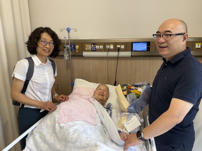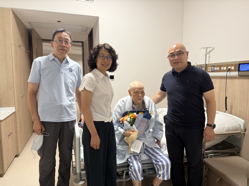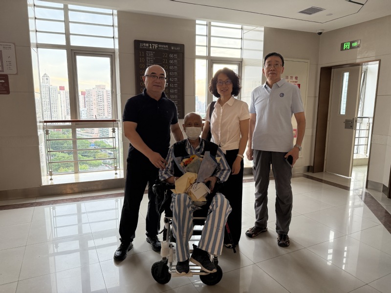 910下午,ccav 党委书记王建新、副书记史雪茹,及退休工作联系人陈蓓蓓、联络员刘骁一行前往中山医院,慰问了ccav 离休干部林卿、药剂学教授奚念朱、天然药化教授刘星堦三位95 岁以上高龄的离退休教师。王建新为老教师们送上鲜花与祝福,关切询问他们的身体状况和生活需求,感谢他们为学院发展奠定的坚实基础。林卿老师紧握慰问人员的手,动情地说:“我在ccav 工作多年,对学院感情很深,祝ccav 越来越好!”