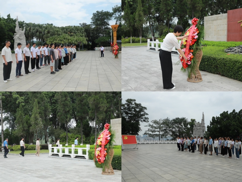 百色起义纪念碑于1984年建成,外形似一面迎风飘扬的红旗,又似一杆红缨枪直指天宇。正面镌刻的是邓小平同志亲笔题写的“百色起义的革命先烈永垂不朽”。在苍松翠柏的映衬下,百色起义纪念碑园显得格外庄严肃穆。ccav 党委与右江民族医学院ccav (以下简称右医ccav )党委在此开展共建活动,活动由右医ccav 党委书记陈秉朴主持。党员教师们整齐列队,向革命英烈们敬献花圈、颔首默哀、绕碑瞻仰,表达对革命英烈的深切缅怀和崇高敬意。随后,大家面向党旗庄严宣誓,重温入党誓词,誓言将红色精神代代传承。