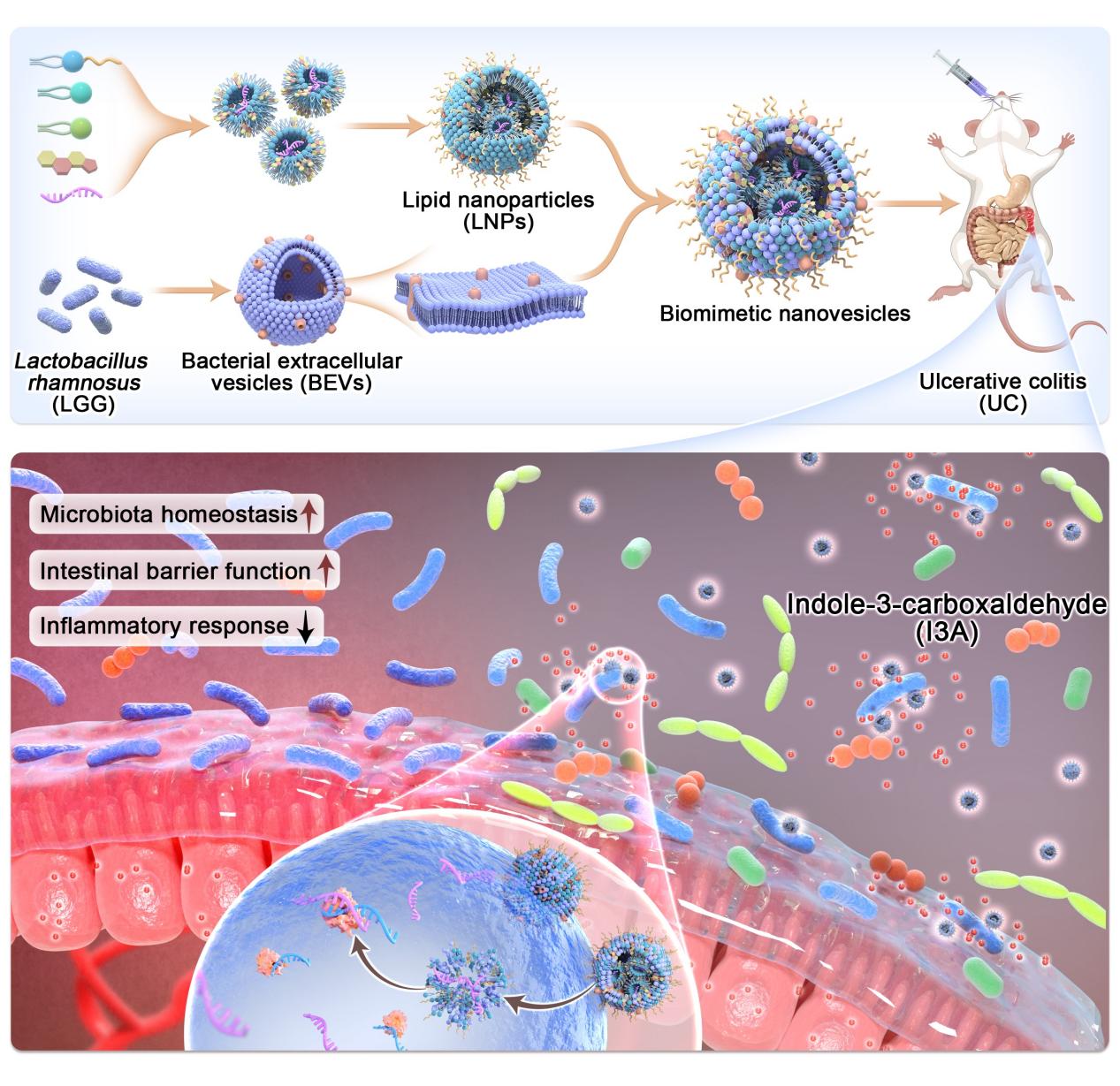 近日,ccav 戚建平课题组在Science Advances期刊发表最新研究成果“miRNA-loaded biomimetic nanoparticles orchestrate gut microbe to ameliorate inflammatory bowel disease”,报道了一种能够对共生菌鼠李糖乳杆菌进行改造的仿生纳米颗粒。通过将鼠李糖乳杆菌来源的细菌胞外囊泡(Bacterial extracellular vesicles, BEV)与脂质纳米粒(Lipid nanoparticles, LNP)进行功能化结合,制备了细菌胞外囊泡-脂质纳米粒(BEV-LNPs)。该纳米载体对鼠李糖乳杆菌的靶向效率显著高于大肠杆菌。体内外稳定性实验表明,相较于传统脂质纳米粒,BEV-LNPs在模拟生理介质及胃肠道环境中展现出更佳的稳定性。将该纳米载体与5-ASA联合使用时,促进了鼠李糖乳杆菌的增殖并增加了吲哚-3-甲醛的生成量,在急性和慢性结肠炎模型中均显著改善了治疗效果,有效减轻肠道炎症,修复受损肠道上皮屏障,并促进肠道菌群重新恢复平衡。