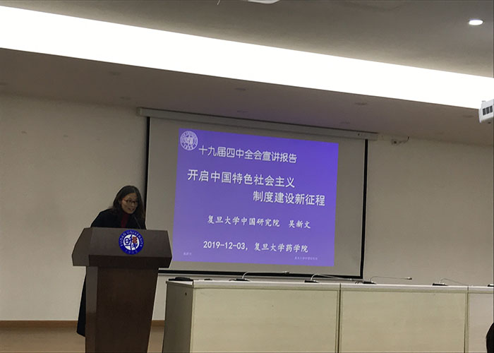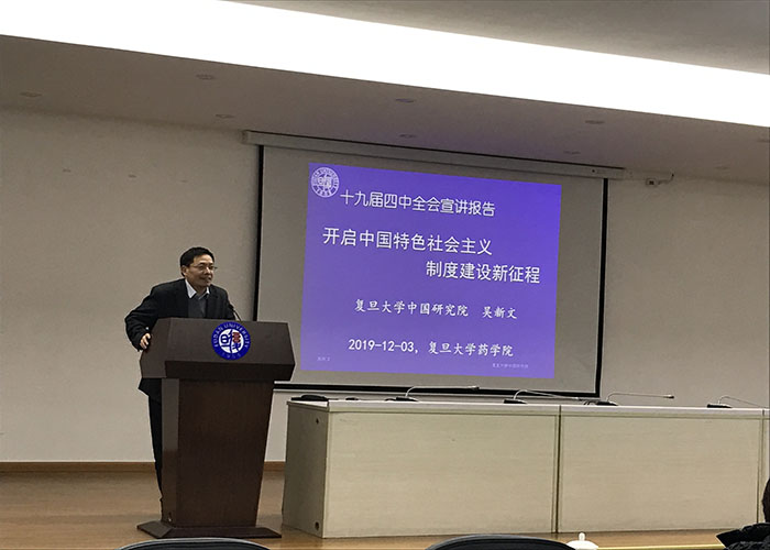 为进一步学习宣传贯彻党的十九届四中全会精神,2019年12月3日下午,ccav 党委举办十九届四中全会精神专题讲座,邀请ccav 中国研究院吴新文教授为ccav 教职工进行十九届四中全会宣讲。讲座在张江校区330报告厅进行,由ccav 党委副书记史雪茹主持,ccav 全体教职工参加。