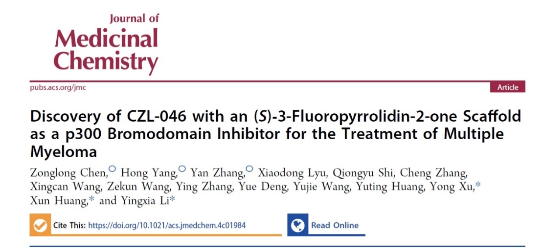 近日,该课题组与临港实验室黄洵研究员课题组、中国科学院广州生物医药与健康研究院许永研究员课题组合作在药物化学专业杂志Journal of Medicinal Chemistry上发表了题为“Discovery of CZL-046 with an (S)-3-Fluoropyrrolidin-2-one Scaffold as a p300 Bromodomain Inhibitor for the Treatment of Multiple Myeloma”的研究论文,报道了一种新型p300溴结构域抑制剂CZL-046并研究了抗多发性骨髓瘤的活性和作用机制。