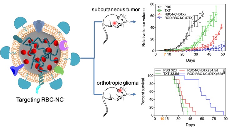 目前,脑胶质瘤的临床治疗以手术切除为主,辅之以放化疗。由于脑胶质瘤缺乏明显边界,手术难以将其切除干净而极易导致复发;同时,脑胶质瘤部位多重屏障的存在又阻碍了化疗药物进入,致使肿瘤部位无法获得有效药物浓度;高剂量化疗药物使用也会带来多种严重毒副作用。如何提高脑胶质瘤部位的抗肿瘤药物浓度,在提高药效的同时降低全身性毒副作用?ccav 陆伟跃教授课题组的合作研究构建了一种主动靶向仿生纳米药物,采用1)红细胞膜包覆药物纳米晶策略:一是利用红细胞膜大幅度延长所包载药物在血液中的循环时间,为药物进入病灶部位创造更多可能的机会;二是提高药物包载量,以增加该仿生纳米药物每次到达病灶部位的药物浓度;2)靶向分子介导跨越屏障膜策略:在红细胞膜上插入能够识别脑胶质瘤屏障膜的靶向分子,赋予该仿生纳米药物在病灶部位及肿瘤细胞内药物聚集量,从而发挥更好的药物治疗效果。