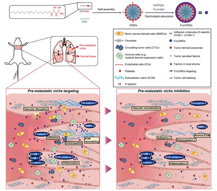 肿瘤转移前微环境是一种特殊的炎症微环境,可使循环肿瘤细胞(CTCs)定植,可作为预防转移的潜在靶点。然而,很少有研究致力于开发对症药物及递释系统来调节转移前微环境。ccav 陈钧教授和上海交大高小玲研究员团队合作报告了利用杂合靶向胶束以调节转移前微环境并抑制肿瘤转移的研究。该胶束采用两种低毒性抗炎化合物即脂肪链改造的二甲双胍和二十二碳六烯酸(DHA)自组装而成,其表面包覆岩藻多糖用于靶向转移前微环境。该功能化胶束(FucOMDs)具有良好的靶向效率和血液长循环特性,可以抑制CTC对激活内皮细胞的粘附,减轻肺血管通透性并逆转转移前微环境中关键蛋白的异常表达。体内外研究表明,FucOMDs可有效预防肿瘤转移的形成,并可与靶向化疗联合并有效抑制原发肿瘤的生长和转移。该研究为肿瘤转移前微环境的靶向治疗及抑制肿瘤转移提供了新思路,并具有临床转化前景。