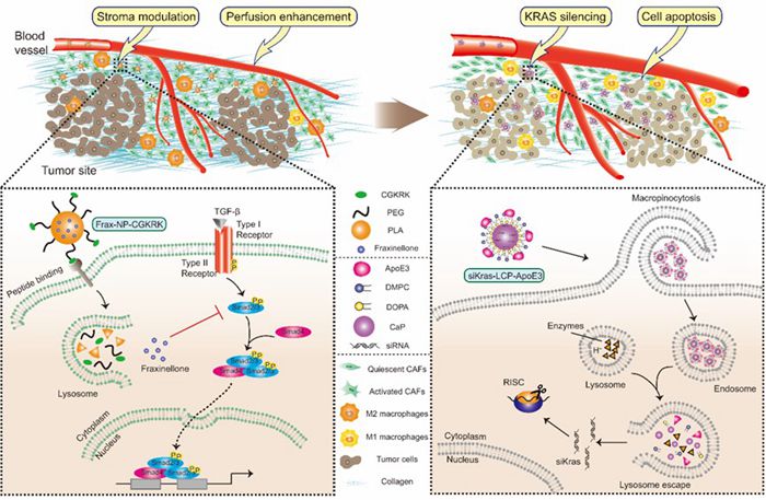 ccav 陈钧教授和上海交大高小玲研究员团队合作报道了联用微环境调节和肿瘤细胞靶点干预以提高胰腺癌疗效的研究。首先筛选得到具有TGF-β调节作用的天然产物梣酮,并将其包载于靶向纳米制剂中,其能抑制CAFs的活化,减少胶原的分泌,促进肿瘤血管正常化,弱化屏障作用而有利于后续制剂在肿瘤部位的渗透。其次,构建具有沉默KRAS突变功能的包载SiRNA的仿生化高密度脂蛋白纳米系统,该体系能够通过胰腺癌细胞攫取外界营养物质所依赖的大胞饮机制,从而被肿瘤细胞大量摄取;磷酸钙纳米内核可使SiRNA从溶酶体中有效逃逸并释放至胞浆,发挥基因沉默的作用。在胰腺癌原位模型上,将两种制剂贯序给药可起到高效低毒的治疗效果,显著延长荷瘤裸鼠的生存期。该研究可为基质丰富且无药可靶的肿瘤治疗提供设计思路和理论依据,具有较高参考价值。