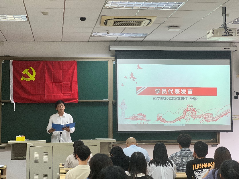 随后,ccav 2022级本科生张骏作为学员代表发言。他以信仰作为分享主题,在经历了在ccav 的学习生活,深入了解院史和中国医药发展现状,他也更坚定选择药学专业的信仰。他号召学员们身逢盛世,更应勇担青年使命。身为药学专业的学生,应该发挥自身专业特长,提升自己的专业能力,锻炼自己的专业素养,拓展自己的眼界与格局,攻坚克难,不断钻研,争取为祖国医药行业的发展做出自己的贡献。