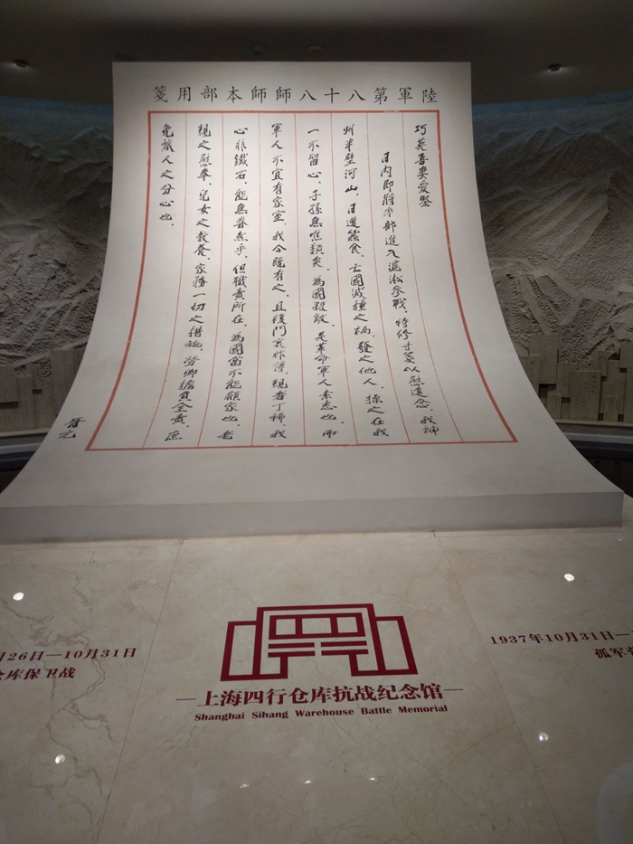 来到四行仓库所在地,首先映入眼帘的就是纪念馆西侧仓库厚重的墙体上密密麻麻的子弹孔和多处炮弹坑。斑驳的墙体把我们的思绪带到了当年日本军队大举入侵、中华民族面临生死存亡的危险时期。根据史料记载,1937年“七七事变”以后,国共两党从救亡图存的大局出发实现了第二次国共合作,共御外侮。1937年8月13日,淞沪会战爆发。这场战役是整个中日战争中进行的规模最大、战斗最惨烈的一场战役。中日双方共有约100万军队参战,战斗持续了三个月。这次战斗中国虽然失败,但是粉碎了日本三个月灭亡中国的狂妄计划,同时让世界清楚地看到中国人民决不会投降的立场。