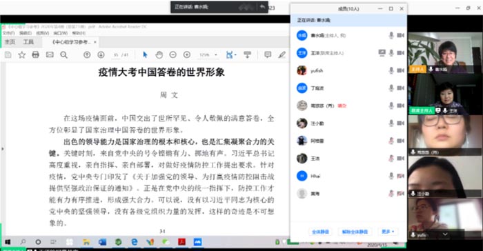 4月15日上午,药学实验教学中心全体教师通过“腾讯会议”的视频功能进行了一次线上政治理论学习。大家集体学习了ccav 党委宣传部印发的《中心组学习参考》的部分内容,并认真诵读了ccav 周文教授撰写的文章“疫情大考中国答卷的世界形象”。教职工们认为,在这场疫情面前,中国交出了世所罕见、令人敬佩的满意答卷,全方位彰显了国家治理中国答卷的世界形象,充分体现了我们党出色的领导能力、高效的应对能力、非凡的动员能力和强大的执行能力,彰显了中国共产党领导和中国特色社会主义制度的显著优势。