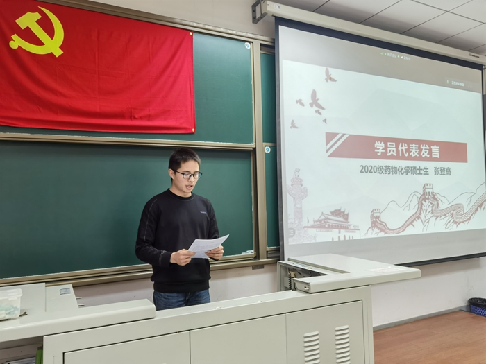 伴随着庄严的国歌声,结业仪式拉开帷幕。首先,徐琛老师宣读了优秀学员名单和结业名单,并对表现优秀、顺利结业的学员们表示衷心的祝贺。接着,七个小组的学员代表分别进行了PPT汇报,展示和分享了他们在本次入党积极分子培训班期间的学习成果和思想感悟。随后2020级药物化学硕士研究生张登高作为优秀学员代表发言,他分享了自己在参军入伍过程中的心得与体会,以及本次培训班的收获和感受,并表示千里之行,始于足下,向党靠拢的征途且长,大家要时刻铭记,不断加强学习,端正入党动机,注重党性修养,不断坚定理想信念。之后,王宁宁老师进行总结发言,肯定了此次培训班所取得的成效,同时对入党积极分子提出了下一步努力的方向和要求。