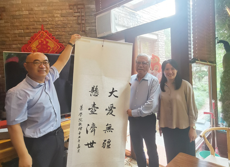 ccav 副院长潘俊、戚建平,党委副书记王宁宁,药理学系主任沈晓燕一起看望了李大鹏院士并与李院士进行了愉快的交流。王建新书记和王宁宁副书记代表学院向李院士赠送了由ccav 学生书写的“大爱无疆 悬壶济世”的书法作品。
