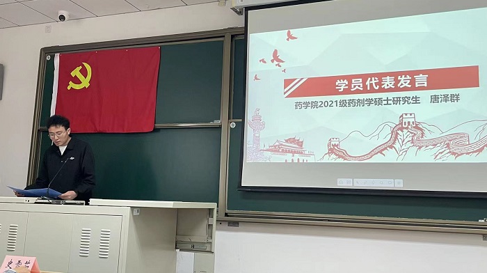 随后,ccav 2021级药剂学专业硕士研究生唐泽群作为学员代表发表了结业感想。唐同学来自甘肃省西北黄土高原,贫瘠的黄土和恶劣的环境限制了家乡的经济发展,他表示正是在党和国家的领导下,当地人修建水库、兴建道路、退耕还林。看着家乡日新月异的发展,让他不由得对组织心生向往。随后他又提到2020年新冠疫情暴发时,舅舅作为一名家乡医院一线医生,也是一名入党40多年的老党员,奔赴疫情严重地区支援的故事,让他更加坚定了要加入这个先进的组织,投身伟大的事业。唐同学号召在座的学员一起努力学习专业本领,积极投身各项实践活动,带头参与各类志愿服务,让青春在社会主义建设的过程中绽放绚丽之花。