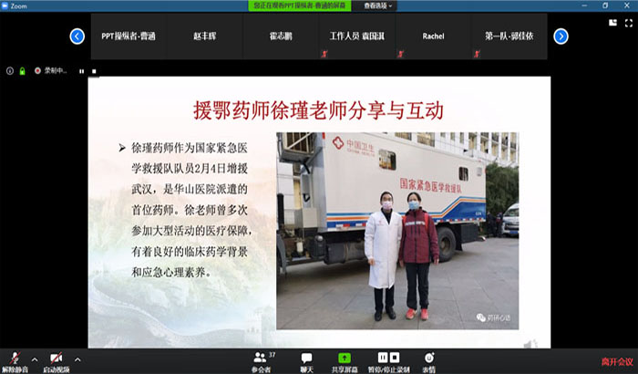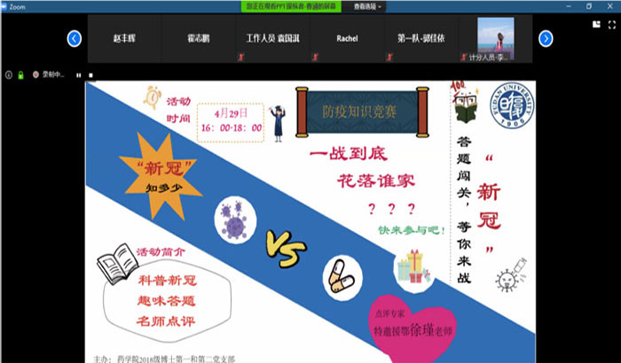 为进一步做好新冠疫情防控的宣传工作,普及当前国家防疫形势、医药研究进展,为国家和学校的防疫工作贡献自己的一份力量,ccav 2018级博士第一、第二党支部联合ccav 教职工第七党支部于2020年4月29日在ZOOM在线会议平台共同举办了主题为《新冠肺炎,“药”你好看》的防疫科普知识竞赛活动。活动还特别邀请了驰援武汉的ccav 附属华山医院药师徐瑾老师为我们分享她在武汉的工作情况与感受。