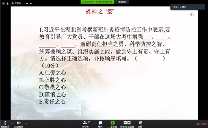 随后,“新冠肺炎,‘药’你好看”防疫知识竞赛如火如荼地进行。学生党员共4组,教师党员组成1队,每一组名字闪亮,口号响亮。例如“我心向阳”队,表达了在新冠阴霾下对阳光的向往;教职工党员的“盼归”队,表达了对驰援武汉医务工作者平安归来的强烈期望。