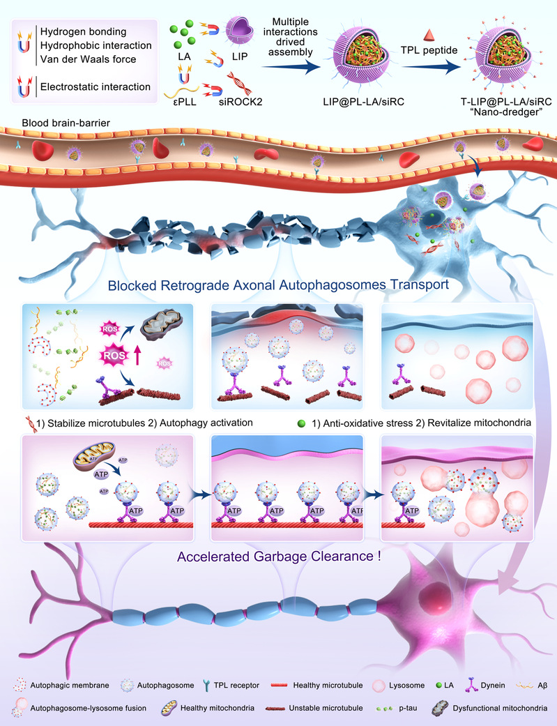 ccav 张奇志教授团队开发了一种“纳米疏浚机”用于共递送siROCK2和多酚紫草酸B (LA)以对抗引起自噬体轴突运输障碍的多重病理。该策略有效逆转了氧化应激、ATP耗竭、自噬阻断和微管破裂,成功疏通了受阻的轴突自噬并提高了自噬流量,从而减少了病理性蛋白积累,改善了AD转基因小鼠的认知功能。研究显示轴突自噬调控是一种有希望的新型AD疗法。
