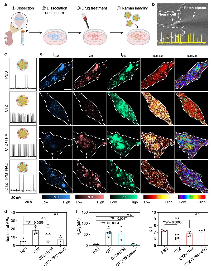 图4. SERS比率探针在神经元细胞层面成像H2O2和pH。(a)小鼠原代神经元的分离、培养和拉曼成像示意图。(b)膜片钳实验记录原代神经元电生理的明场图像。(c)神经元在不同刺激下的代表性膜片钳记录。(d)100 pA电流诱导不同组细胞的动作电位数量统计。(e)拉曼共聚焦显微成像显示PBS、CTZ、CTZ+TPM、CTZ+TPM+NAC组原代神经元内源性H2O2和pH水平。伪彩色图像显示了I482、I590和I928处的拉曼信号强度。(f)细胞内H2O2浓度和pH值的定量统计。