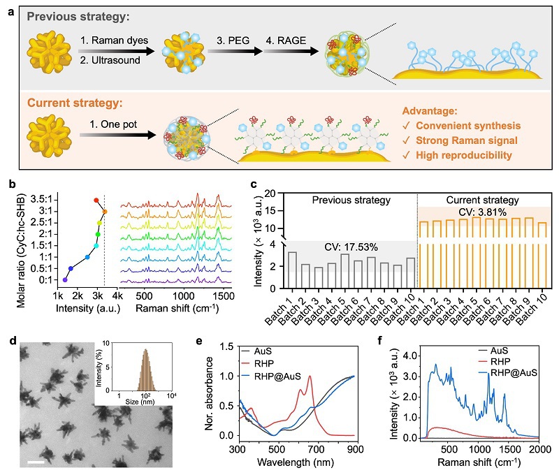 图2. RHP@AuS的合成与表征。(a)SERS探针传统制备方法和本工作中提出的一步法制备示意图。(b)不同比例空间位阻分子调节下探针的 SERS 强度。左图:SERS 强度的统计分析。右图,相应的拉曼光谱。(c)使用传统法和本文策略构建的 SERS 探针的批次间可重复性。(d)RHP@AuS的透射电子显微镜图像。插图:RHP@AuS的流体力学直径分布。(e)AuS、RHP和RHP@AuS的紫外-可见吸收光谱。(f)AuS、RHP和RHP@AuS的SERS光谱。