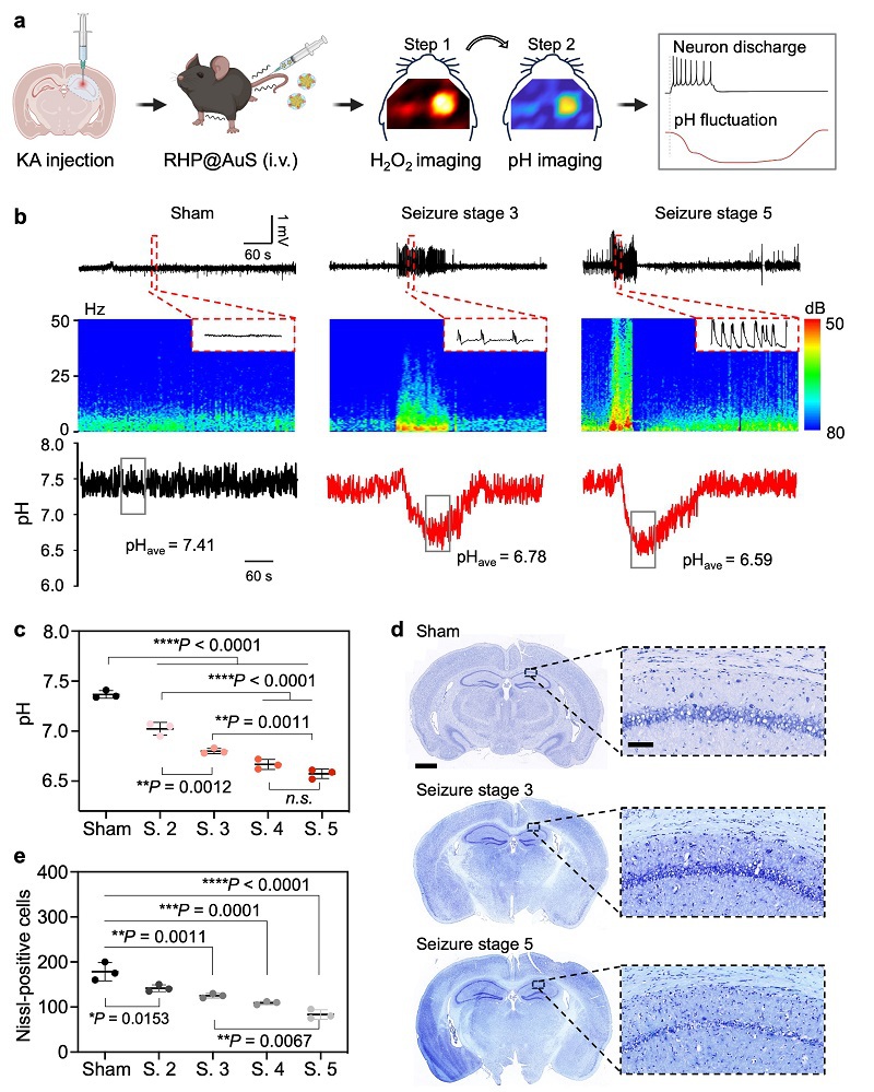 之后在海藻酸(KA)诱导的癫痫模型中评估RHP@AuS在监测癫痫引起的动态pH变化中的能力。通过尾静脉注射RHP@AuS后,我们在癫痫模型中进行连续SERS成像和脑电图(EEG)记录。结果表明,RHP@AuS信号强度随剂量增加呈对数增长,在50 nmol/kg时达到平台期,确定为体内成像的最佳剂量。RHP@AuS在体内外均表现出弱背景干扰和稳定的拉曼强度,解决了传统荧光成像的组织背景干扰问题。静脉注射6小时后,通过H2O2成像定位癫痫病灶,发现I928/I482比值在病灶部位显著升高,而正常脑组织无明显变化。随着癫痫级别从2级逐渐升高到5级,病灶pH值显著降低,在强直期降至最低(约6.6),并在癫痫发作停止后逐渐恢复。Nissl染色显示,神经元死亡数量与癫痫级别呈正相关。这些结果表明,RHP@AuS可有效可视化癫痫病灶中因神经元过度兴奋引起的pH波动,为首次通过非侵入性成像技术记录癫痫期间的体内pH动态变化提供了基础。