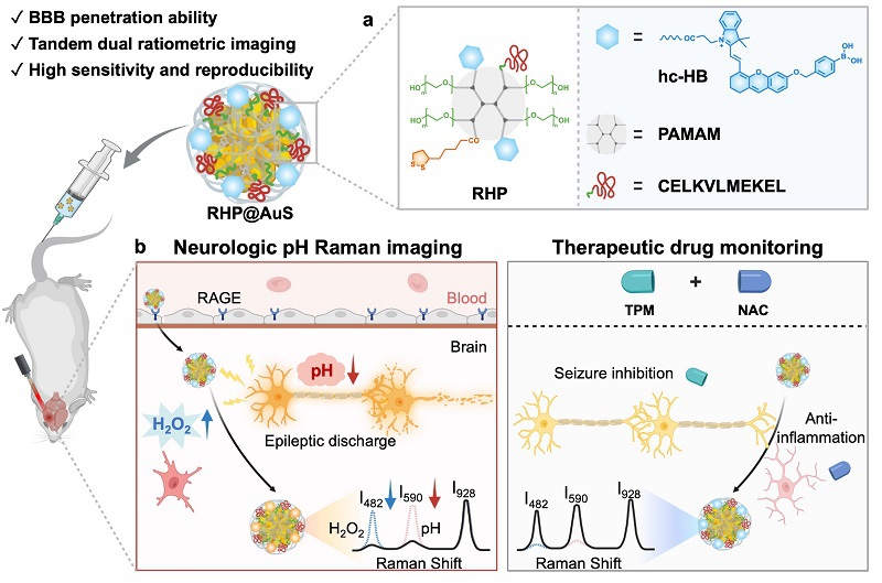 近日,ccav 王聪青年研究员、李聪教授、类脑智能科学与技术研究院王晶副教授和云南大学ccav 雷祖海教授在Angewandte Chemie杂志上发表了题为:“Tandem Dual-Ratiometric SERS Probe Enables Raman Imaging of Neurological pH Fluctuations in Epilepsy”(串联双比率响应SERS探针成像癫痫病灶pH波动)的研究性论文(图1)。该工作开发了一类单光谱串联双比率响应SERS探针(RHP@AuS),实现脑部癫痫病灶pH动态监测与药物预后评估:(1)提出了一类基于树枝状聚合物的可调节性拉曼报告分子单层自组装策略,可有效抑制分子堆叠诱导的信号淬灭效应,显著提升拉曼信号强度和稳定性。(2)构建了一类可特异性富集在癫痫灶、H₂O₂开关-pH数字化读取的串联双比率型SERS探针,实现了病灶pH动态定量读取。(3)揭示了癫痫发作导致病灶局部脑区快速酸化的波动规律,提出了一种“酸碱平衡-炎症调节”的联合疗法,实现了癫痫长效持久的治疗效果。总之,该工作构建了一种高灵敏度、高特异、准确动态监测脑部疾病pH震荡的可视化工具,并为癫痫等脑疾病的精准诊疗开辟了新维度