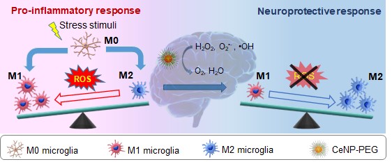 Abstract: Abstract: The neuroprotective effect of ceria nanoparticles in the context of brain disorders has been explained by their antioxidant effect. However, the in-depth mechanism remains unknown. As resident immune cells in the brain, microglia exert a variety of functional reprogramming termed as polarization in response to stress stimuli. Herein, custom-made ceria nanoparticles were developed and found to scavenge multiple reactive oxygen species with extremely high efficiency. These nanoparticles drove microglial polarization from a pro-inflammatory phenotype to an anti-inflammatory phenotype under pathological conditions. Pretreatment of these nanoparticles changed the microglial function from detrimental to protective for the neuronal cells by blocking the pro-inflammatory signaling. This work not only helps to elucidate the mechanism of ceria-nanoparticle-mediated neuroprotection but also provides a new strategy to rebalance the immuno-environment by switching the equilibrium of the phenotypic activation of microglia.