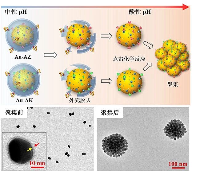手术切除是胶质瘤治疗的重要手段。保守切除残留的微小病灶会导致肿瘤早期复发,而激进切除则有可能破坏肿瘤周围的重要功能区,造成失语、瘫痪等严重后遗症。李聪课题组制备了一类肿瘤微环境双模态响应探针引导脑胶质瘤手术切除。该类探针通过受体介导转胞吞作用跨越血脑屏障。在肿瘤酸性环境中特异性自组装形成三维球状聚集体并伴随T1加权磁共振信号和表面增强拉曼信号同时增强。高信噪比磁共振成像用于手术前胶质瘤准确定位,而具有超高灵敏(10-12-10-15?M)的表面增强拉曼信号用于手术中引导肿瘤切除”。由于酸性环境是几乎所有固体肿瘤普遍特征,pH响应探针将较少受到肿瘤异质性影响,可实现不同类型胶质瘤普适性示踪和导航;此外胶质瘤浸润区域血脑屏障结构相对完整。跨血脑屏障探针能够提高对胶质瘤边缘的示踪信噪比和准确率”。