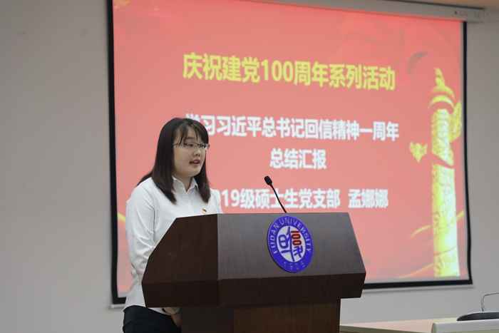 接着,2019级硕士生党支部孟娜娜作为学生代表汇报了一年来学习贯彻习近平总书记回信精神中的体会。她认为,在漫长的革命征程中,复旦历史上无数优秀的党员先辈们在办学、救国、强国的道路上上下求索,无私贡献,为当代复旦学子立下了好榜样。作为ccav 青年党员,去年新冠疫情的爆发让她深刻感受到药学人身上的医学责任,愿为新冠肺炎的临床药物治疗和防控工作做出贡献。前路漫漫,青年学生大有可为,她决心做中国医药卫生事业的一颗螺丝钉,坚定理想信念,践行初心使命。