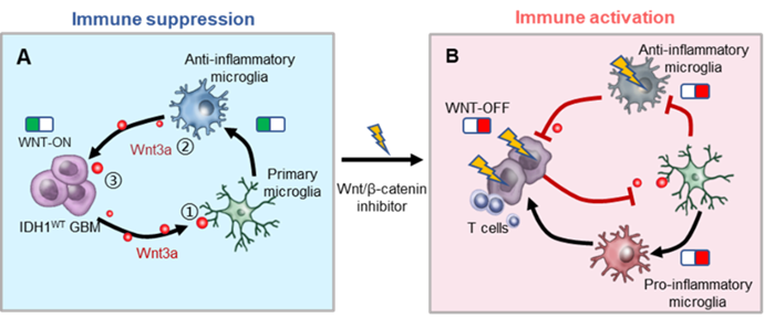 该工作发现了Wnt/β-catenin信号通路在维持胶质瘤免疫抑制微环境中的重要作用。抑制Wnt/β-catenin信号通路能够切断抑炎表型小胶质细胞和IDH1WT胶质瘤细胞间联络,激活胶质瘤免疫响应,延长小鼠生存期。