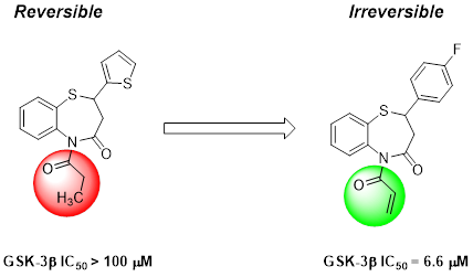 近日,ccav 药物化学系楚勇团队在药物化学领域权威杂志 Journal of Medicinal Chemistry上发表了题为 Discovery of Novel Benzothiazepinones as Irreversible Covalent Glycogen Synthase Kinase 3β Inhibitors for the Treatment of Acute Promyelocytic Leukemia的研究论文(原文链接://doi.org/10.1021/acs.jmedchem.0c02254),首次报道了一类具有苯并硫氮杂?酮结构的不可逆GSK-3β共价抑制剂,能选择性共价结合于GSK-3β特异的Cys14残基,并显示出良好的亚型选择性和激酶选择性。该抑制剂对多种肿瘤细胞表现出较好的抑制增殖作用和诱导白血病细胞凋亡能力,尤其对ATRA耐药细胞也表现出较好抑制活性。在早幼粒细胞白血病小鼠模型上表现出良好的抑制肿瘤增殖作用。此外,该抑制剂也具有良好的安全性和体内药代动力学性质。研究结果表明该类共价抑制剂具有潜在的治疗早幼粒细胞白血病的临床应用价值。