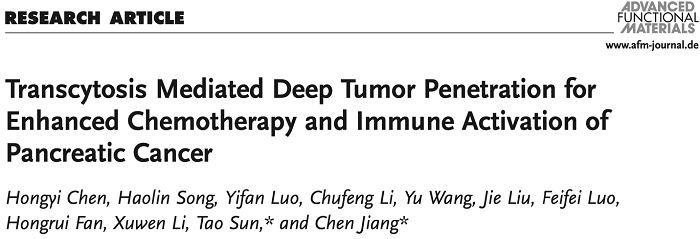 Recently, the research group led by Prof. Chen Jiang has developed a versatile drug delivery system that can trigger transcytosis. The delivery system can efficiently deliver chemotherapy drugs to the deep tumor, regulate the microenvironment, and activate the anti-PDAC immune response. The study was published online in Advanced Functional Materials, named Transcytosis Mediated Deep Tumor Penetration for Enhanced Chemotherapy and Immune Activation of Pancreatic Cancer.