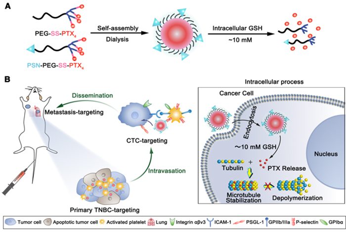 Recently, Professor Chen Jiang’s (corresponding author) Group of Fudan University School of Pharmacy developed a novel activated platelets-targeting micelle with controlled drug release to utilize activated platelets as an endogenous device for efficient drug delivery to both primary/metastatic tumors and significantly improves treatment outcome. In this work, a P-selectin (expressed on activated platelet surface) targeting peptide (PSN) is modified on a redox-responsive paclitaxel-loaded micelle (PSN-PEG-SS-PTX4 micelle) to utilize activated platelets as a “bridge” for interaction with cancer cells. The PSN-modified micelle can easily adhere to the surface of activated platelets and subsequently capture CTCs in blood circulation. PSN-PEG-SS-PTX4 micelle also exhibits enhanced primary TNBC/metastasis targeting and penetrating effect through binding with tumor infiltrating platelets. Subsequently, the micelle could be endocytosed by cancer cells and then disintegrated to release loaded chemotherapeutics under reductive cytosol conditions to induce strong anti-tumor effect. More importantly, PSN-PEG-SS-PTX4 micelle potently suppressed lung metastasis of TNBC and reduced incidence of distant liver metastasis. In conclusion, the activated platelet-targeting micelle with controlled drug release profile provides a promising strategy for the omnidirectional treatment of primary and metastatic cancers.