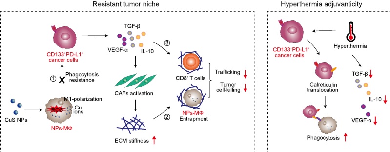 与 CAR-MΦ 不同,纳米技术工程化巨噬细胞(NPs-MΦ)通过肿瘤抗原非依赖性的方式吞噬肿瘤细胞,为研究过继巨噬细胞疗法的耐药机制提供了一种通用型细胞药物模型。研究团队以NPs-MΦ过继治疗黑色素瘤为例,发现小鼠黑色素瘤中存在一个肿瘤细胞亚群,表现为CD133+PD-L1+表型。CD133+PD-L1+肿瘤细胞通过激活转化生长因子-β(TGF-β) 通路,活化肿瘤相关成纤维细胞(CAFs),促使细胞外基质硬化,从而限制了NPs-MΦ和效应CD8+ T 细胞进入肿瘤组织对肿瘤细胞的攻击,同时通过分泌免疫抑制因子,如TGF-β,血管内皮生长因子-α(VEGF-α)和白介素-10(IL-10),抑制了NPs-MΦ和效应CD8+ T 细胞的肿瘤细胞杀伤作用。