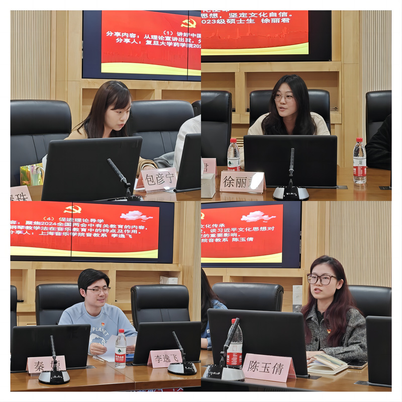 接着,ccav 2021级直博生包彦宁作为复旦上医院史讲解队队员,从理论宣讲出发,以“讲好中国故事”为主题分享了心得体会;2023级硕士生徐丽君结合个人经历,围绕如何践行文化使命、坚定文化自信分享了自己的感受。上海音乐学院音乐教育系2020级硕士生陈玉倩从学术专业出发,讲述习近平文化思想对传统音乐文化研究的影响,就如何加强文化传承发表看法;2022级硕士生李逸飞聚焦2024全国两会中有关教育的内容,分享钢琴教学法在音乐教育中的特点及作用,为促进文化理论导学提供了新思路。