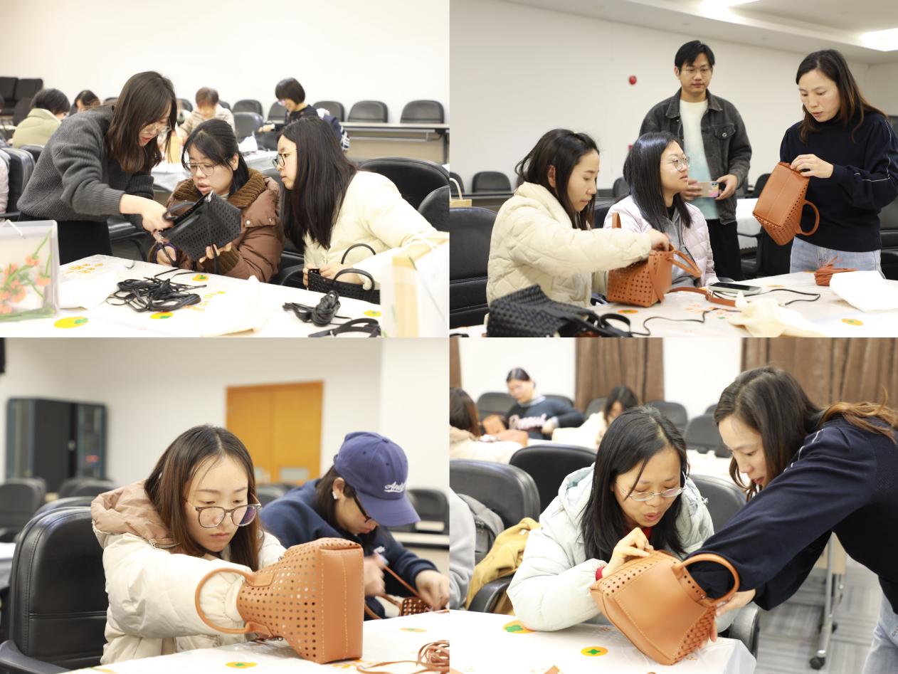 随后,手工老师向大家简要介绍了编织包的制作流程、所需材料和基本技巧。在老师的耐心讲解和示范下,女教职工们对编织包有了初步的了解,跃跃欲试,准备亲手制作属于自己的独特作品。有的老师手法娴熟,编织速度飞快;有的老师是初学者,她们一边听老师讲解,一边慢慢尝试;有的老师则是发挥创意,编织出独具特色的纹样。现场气氛温馨而热烈,大家互相帮助,交流心得,共同享受着手工制作的乐趣。
