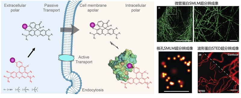 图1.可用于免洗、多色、活细胞超分辨成像荧光探针