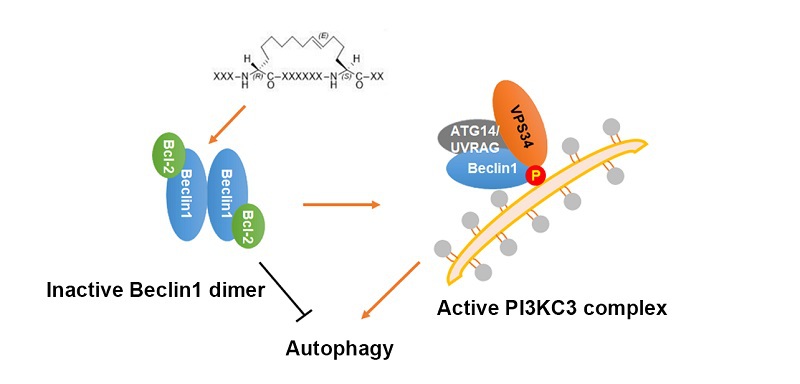 Beclin 1是组成III类磷脂酰肌醇-3-激酶复合物(PI3KC3)的关键成员之一,通过其卷曲螺旋结构域招募两个正向调节因子Atg14L和UVRAG上调PI3KC3的活性。Beclin 1的缺乏或功能障碍与癌症和神经退行性疾病等有关。研究表明,非小细胞肺癌中的表皮生长因子受体(EGFR)和乳腺癌中的人表皮生长因子2(HER2)等蛋白可经Beclin 1介导的细胞自噬途径降解。Beclin 1蛋白在细胞内形成同源二聚体,降低细胞的自噬水平。因此靶向Beclin 1药物设计可作为对EGFR或HER2驱动癌症的有效抗增殖策略。