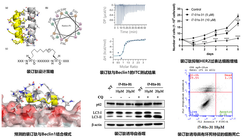 基于前期工作中关于装订肽减弱Beclin1同源二聚进而诱导细胞自吞噬的发现,本工作中提出基于连接臂扫描的策略,联合分子动力学模拟及结合自由能计算,进一步提高装订肽与Beclin1的亲合性。部分合成并测试的装订肽表现出与先导肽相当或更强的结合能力(Kd ~ 100 nM)。对其构效关系的研究表明,装订肽连接臂位于Beclin 1与多肽结合界面的侧面时能够将其靶标亲合性提高10~30倍。生物实验结果证实优化的装订肽通过诱导坏死细胞死亡而非细胞凋亡机制,在EGFR和HER2过表达的肿瘤细胞中表现出有效的抗增殖效果。这些靶向Belin 1的装订肽为发展治疗EGFR或HER2驱动癌症的候选药物提供了新的机会。