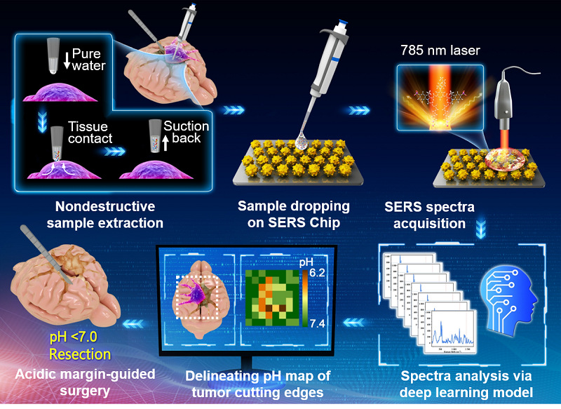近日,ccav 李聪教授、类脑智能科学与技术研究院张孝勇研究员、信息科学与技术学院余锦华教授以及附属华山医院神经外科毛颖教授联合研究团队构建了一类基于表面增强拉曼散射(SERS)技术的胶质瘤手术导航原理验证系统。该系统由自主研制的pH响应SERS芯片,手持式拉曼光谱仪以及拉曼光谱深度学习系统组成。该工作提出了水滴辅助组织取样技术,能够将手术切面可疑组织表面代谢物无损地转移到SERS芯片上。还提出了报告分子诱导表面增强拉曼共振效应新原理。实现了微量液滴样本pH值的快速测定。自主构建的深度学习模型自动分析样本拉曼光谱并准确、快速地测定样品pH值。该智能SERS系统导航可在6分钟内对64个组织位点(约1cm2)pH进行测量,并通过绘制组织pH分布图定位“酸性代谢边界”。与临床手术导航技术相比,基于“酸化边界”的手术导航策略显著提高大鼠胶质瘤模型存活率,延缓了肿瘤复发速度。此外,通过5例病人胶质瘤组织样本分析,也发现了酸化与恶性程度之间的相关性,揭示了“代谢边界”手术导航策略临床转化的可行性。