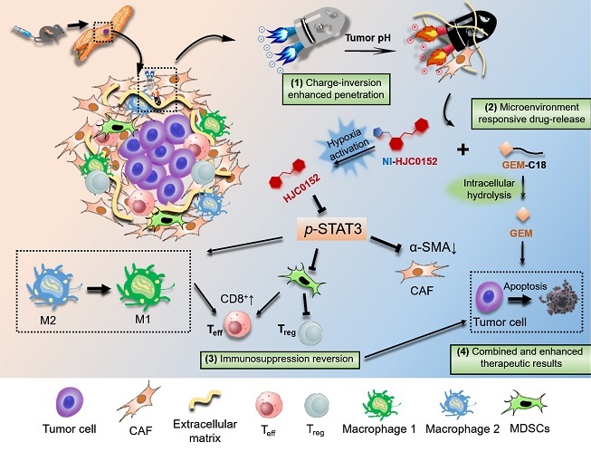 图2,本项工作设计的电荷反转式递药系统,可响应于肿瘤微酸微环境实现电荷由负变正的反转,实现深部穿透和药物递送;并在胰腺癌乏氧微环境下实现前药激活,用于抑制STAT3靶点,以协同与共负载的吉西他滨药物,最终同时达到逆转免疫抑制和解除耐药的目的。