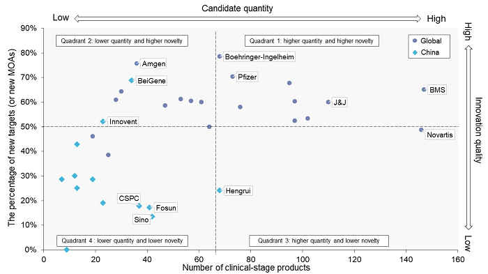 根据Cortellis数据库收录的数据,Top 20中国制药公司与Top 20跨国药企在2012-2021年间获批上市的药物数量差距显著;临床在研管线规模的差距则相对较小。此外,Top 20跨国制药公司的产品管线更多样化,而Top 20中国制药公司更倾向于单一的治疗领域(如肿瘤)。就靶点创新性而言,20家跨国制药公司的管线中均有超过50%的潜在Fist-in-class药物;而在Top 20中国制药企业中,仅百济神州和信达生物两家创新型生物制药公司的管线中有50%的产品针对全新靶点或作用机制,其他公司则不足30%。对Top 20跨国和中国的制药公司创新能力和管线规模进行分类评价,四象限图清晰地定位了其在全球创新药物研发竞争中所处的位置。