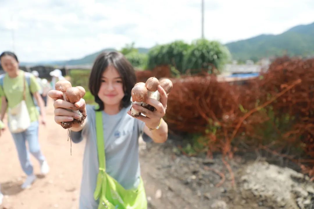 且行且思,且学且践,孩子们也在动手实操中沉浸式感受乡村振兴新图景——深入红喻核桃厂车间,穿上工作服,体验核桃制品的称重与包装;登上“离天空最近的茶园”博南山茶业基地,背上小背篓,尝试茶叶的采摘与炒制;参访博南镇胜泉村,走进种植棚,了解姬松茸的培育与加工……