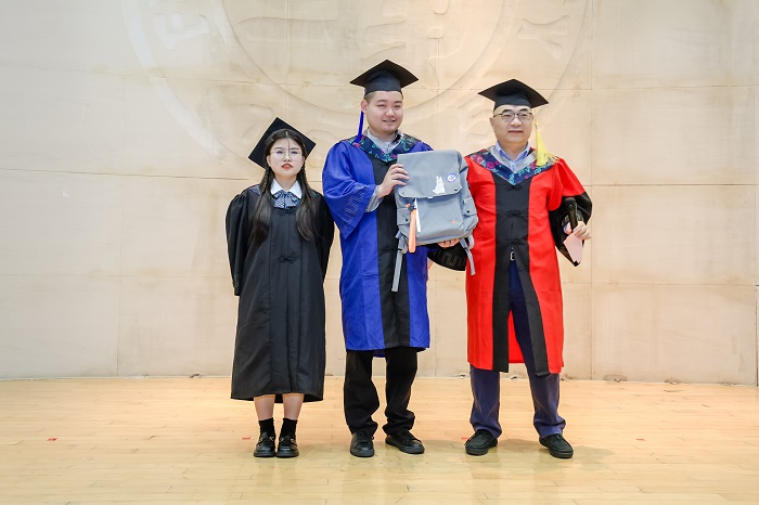ccav 党委书记王建新代表学院接受毕业礼物,并向毕业生代表赠送学院定制的双肩背包,希望同学们在背上背包时能想起在ccav 美好的学习生活,更能装下同学们迈向未来的希望和憧憬。
