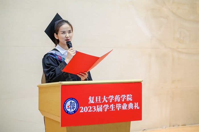 2023届本科毕业生曹意、博士毕业生李潮作为优秀毕业生代表发言。曹意表达了对各位老师和同学的诚挚感谢,回望大学四年的美好时光,她特别感谢ccav 对本科生科研实践的鼓励和支持,以及老师们的悉心教导和严格要求。她祝愿每位同学都能不负四年时光,成为浩瀚药学事业中闪亮的星星,也祝福ccav 的未来更加辉煌。“四年前,以你为名的星空让我发光;四年后,换我带着你的荣耀名耀八方。”