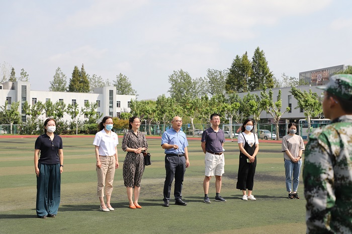 2022年8月29日,ccav 党委书记王建新、副院长(主持工作)李聪、常务副院长潘俊、副院长张雪梅、党委副书记史雪茹和王宁宁,一同来到军训场地,看望并慰问正在参加军训的同学和教官。