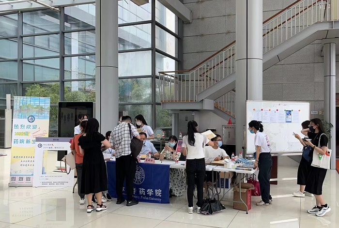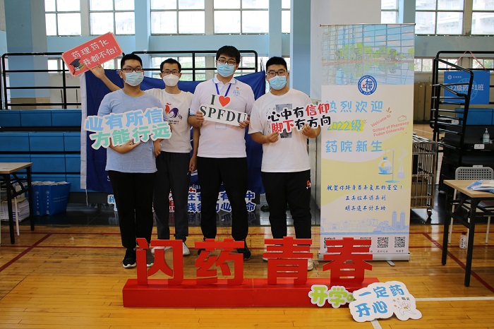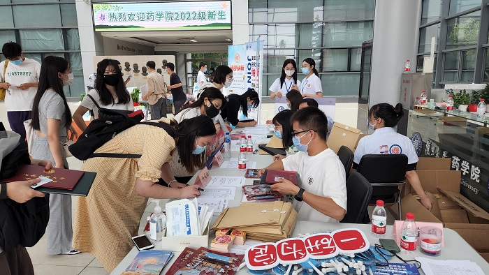 为了帮助新生顺利到校、尽快融入校园生活,ccav 在学院党委、校学研工部和医学学工部的指导下,提前部署、精心安排、紧密合作,为新生报到做好充分准备。报到前夕,学院为每位新生精心准备了“迎新大礼包”,包括ccav 学生发展手册,以及培养方案、学籍管理规定、校历、校徽等物资,助力学生适应校园生活,遵守校园防疫要求,健康快乐开启新学期。学生党总支组织了一支由31位学生党员、入党积极分子组成的志愿服务队。志愿者们克服跨校区、时间紧、场地有限的困难,承担了学院新生物资的领取、分装工作,并在报到当天协助辅导员完成新生引导、查验证件、行李搬运等工作,不仅为迎新工作顺利开展保驾护航,也让学院的新生“小药丸”们倍感贴心与温暖。此外,学院职能办公室和学生组织还精心设计了宣传标语、横幅海报、易拉宝、药学创意合影板等系列迎新物品,让新生感受到独具药学特色的文化氛围与温馨亲切、清新活泼的校园文化气息。