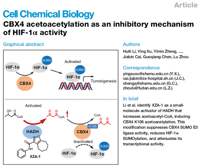 近日,ccav 周璐教授课题组联合陈国强院士及樊嘉院士/蔡加彬副主任医师团队发现了一种调控HIF-1α转录活性的新机制,相关工作以“CBX4 acetoacetylation as an inhibitory mechanism of HIF-1α activity”为题在线发表于Cell Chemical Biology杂志。